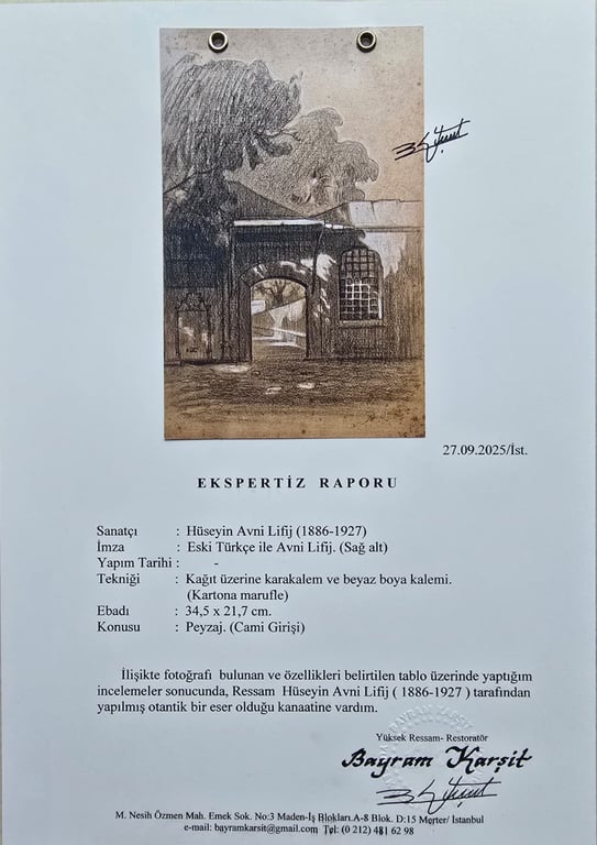 Cami Girişi Peyzaj - Kağıt üzerine karakalem, beyaz boya kalemi (kartona marufle), imzalı - 34,5x21,7 cm